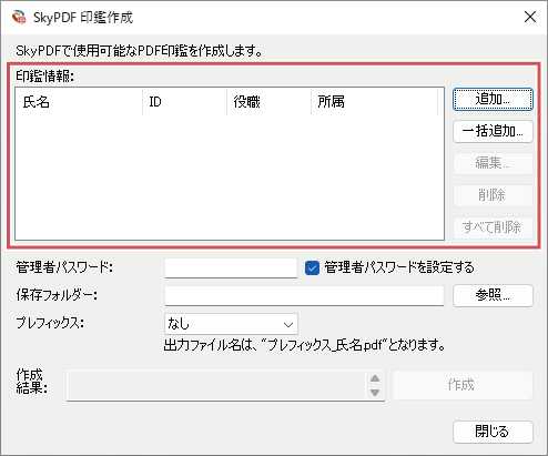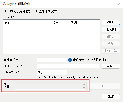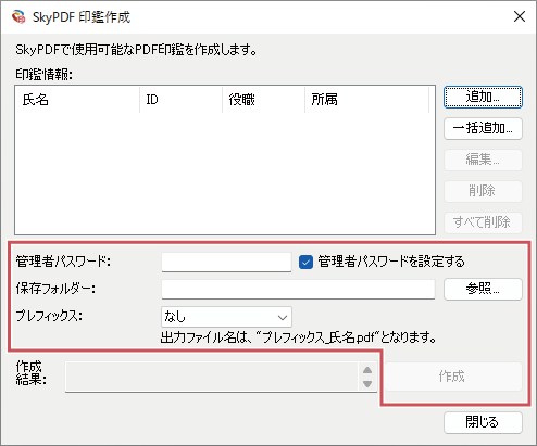 SkyPDF PDF印鑑作成画面で、管理者パスワード、保存フォルダー、プレフィックスを指定して、[作成]を実行します。