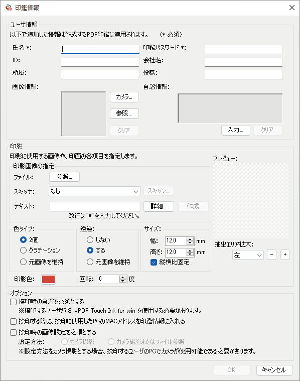 | 自署情報 | 作成するPDF印鑑ファイルに印鑑所有者情報として追加する自署。