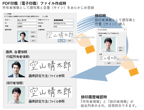これまで捺印時のみ挿入可能であった顔写真、自署(サイン)を、今回の機能拡張でPDF印鑑(電子印鑑)ファイル作成時に所有者情報としてあらかじめ登録しておけるようになりました。