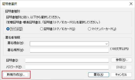 本製品においては、PKCS#7プロファイルを使用しタイムスタンプを含まない署名を付与する際、証明書選択画面の[新規作成]から作成することもできます。
