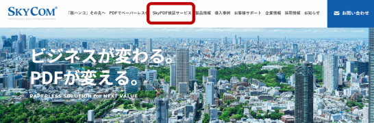 スカイコムは、署名やタイムスタンプの有効性を確認できるSkyPDF検証サービスも提供しています。 受け取った文書が改ざんされていないか、正しい署名かをオンラインで簡単にチェックできます。